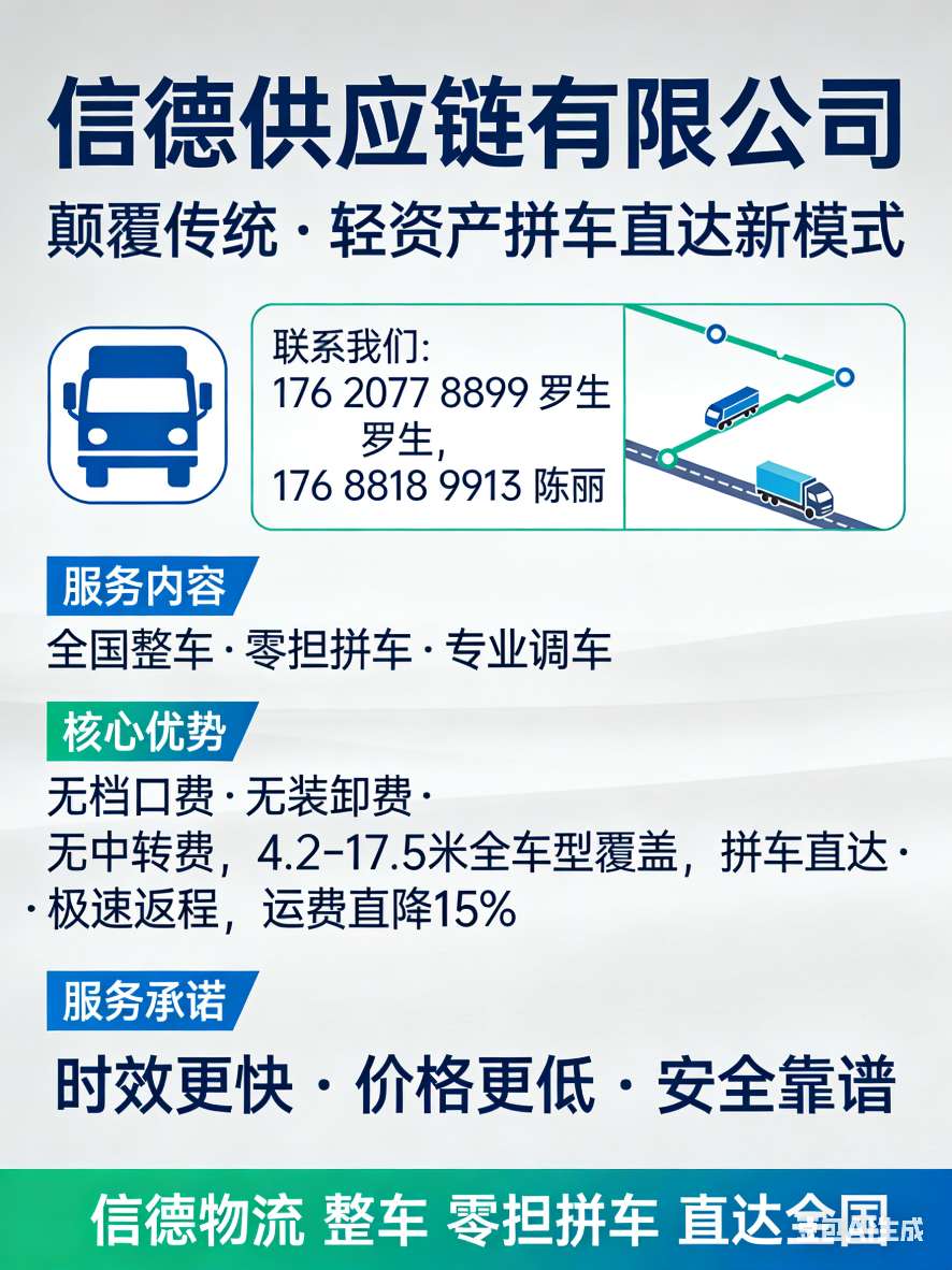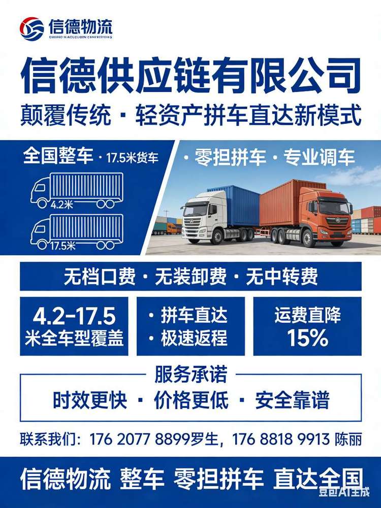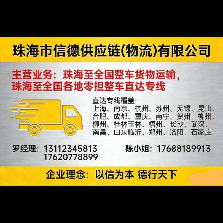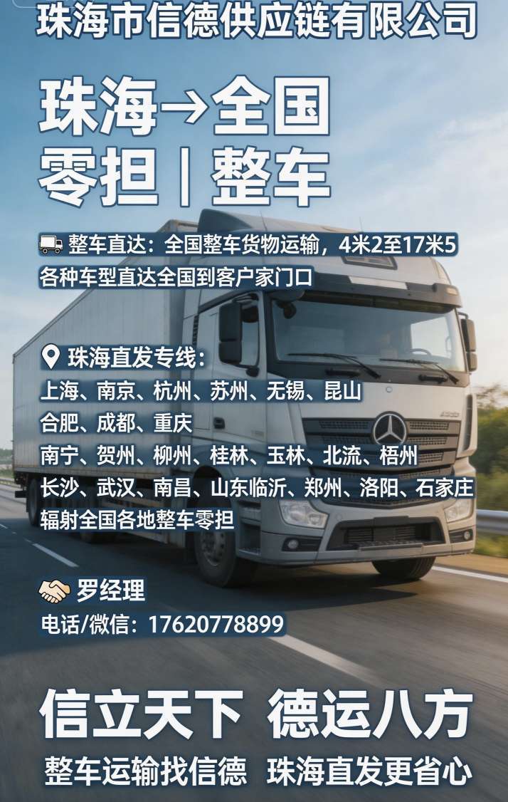 【珠海信德供应链】全国调车 全国直达专线🚛 主营:整车运输、零担配货,全程高速,定时发车。🌏 覆盖:北京、天津、上海、南京、杭州、武汉、成都、重庆、郑州、临沂等全国核心城市。✅ 优势:上门提货+送货上门,全程GPS追踪,破损全额赔付,价格透明无套路。☎️ 131 12345 813176...