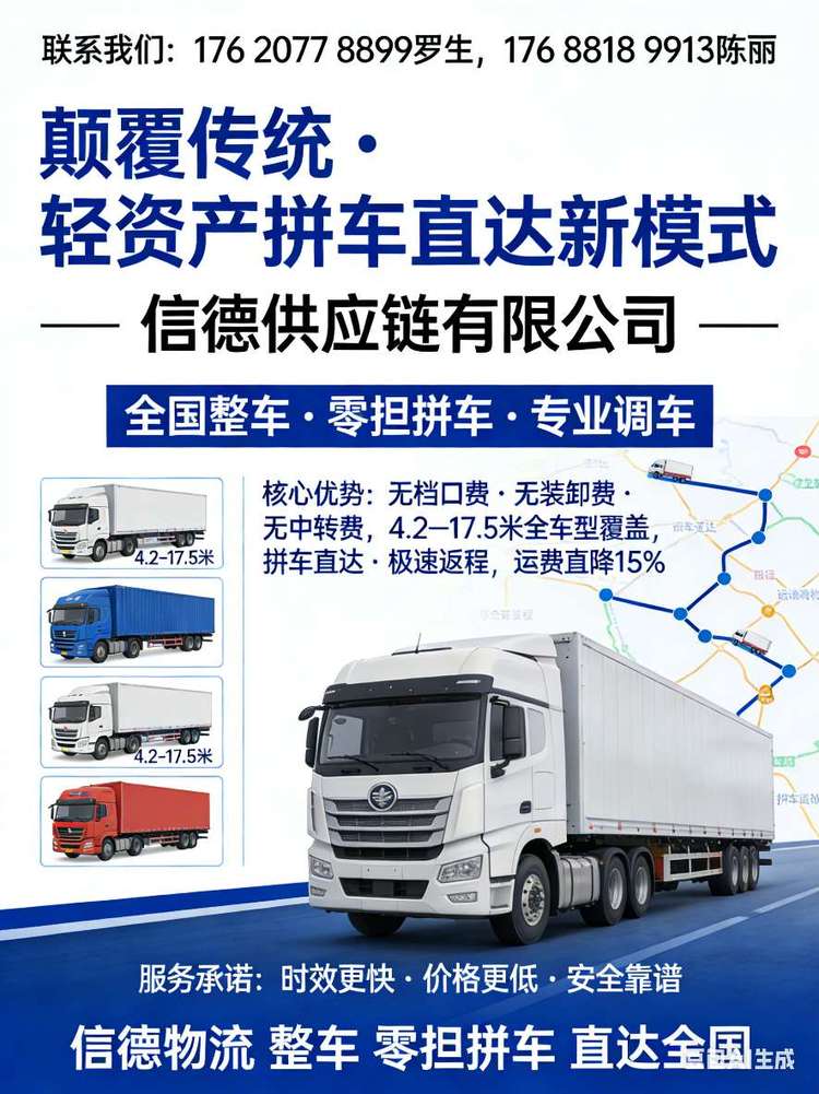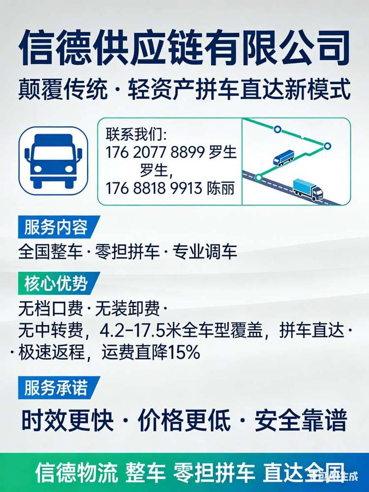 信德供应链有限公司 颠覆传统 · 轻资产拼车直达新模式 📞 联系我们176 2077 8899罗生131 12345 813 📍 全国整车 · 零担拼车 · 专业调车 ✅ 核心优势无档口费· 无装卸费· 无中转费4.2–17.5米全车型覆盖拼车直达 · 极速返程运费直降 15% 🚛 服务承诺时效更快 · 价格更低 · 安全...